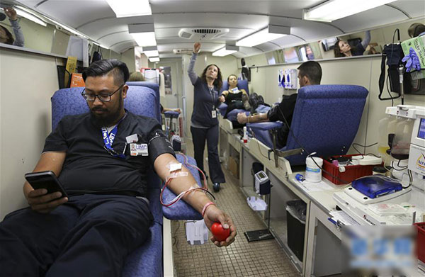 10月3日,人们在美国拉斯维加斯一家采血站献血。由于拉斯维加斯枪击事件发生后抢救伤员需要大量血液,很多市民响应政府号召到当地血站献血,救助伤者。血站媒体负责人介绍,由于献血人数众多,为了避免浪费,血站不得不限制每天的献血人数。新华社记者王迎摄